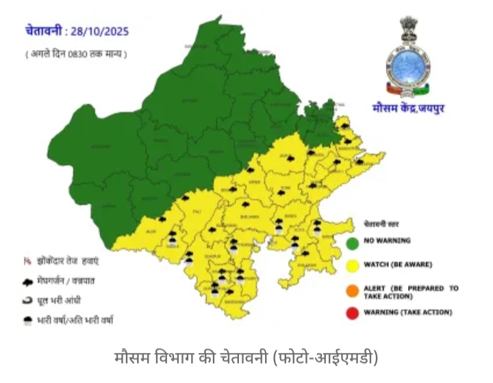 प्राइम टाइम/डेस्क: भारतीय मौसम विभाग (IMD) जयपुर केंद्र ने 28 अक्टूबर को राजस्थान के 7 जिलों में भारी बारिश का अलर्ट जारी किया है। विभाग