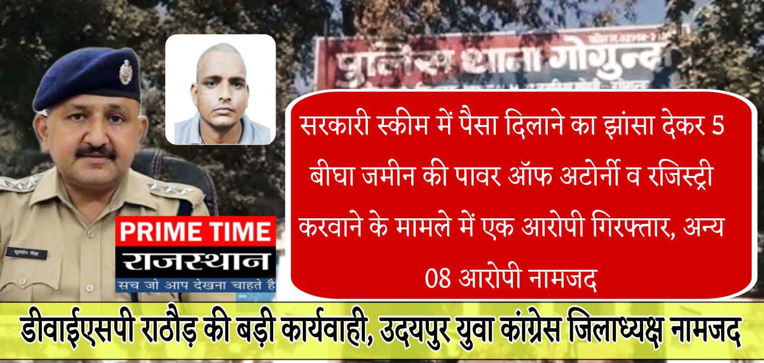 प्राइम टाइम/उदयपुर: पुलिस अधीक्षक जिला उदयपुर योगेश गोयल ने बताया कि थाना गोगुन्दा में सरकारी स्कीम में पैसा दिलाने का झांसा देकर 05 बीघा जमीन